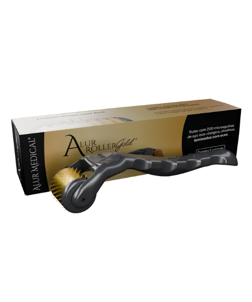 O design ergonômico do Alur Roller Gold proporciona um encaixe perfeito na mão, facilitando o manuseio durante o procedimento. O dispositivo é registrado na ANVISA, embalado em papel de grau cirúrgico e esterilizado por Raios Gama, garantindo a máxima segurança para uso profissional.